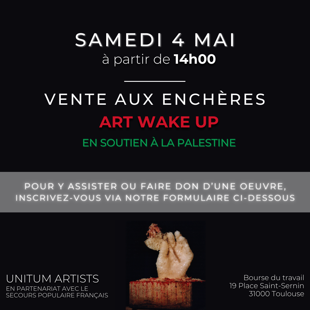 Nous sommes ravis de vous annoncer que Unitum Artists s'associe au Secours Populaire par le biais d’une vente aux enchères spéciale “Art Wake Up”, pour soutenir les victimes de la guerre en Palestine.