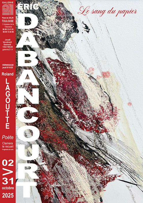 Dans cette exposition « Le sang du papier », nous avons souhaité vous présenter le travail de cet artiste, Éric Dabancourt côtés du recueil « Fragments de soie » du poète Roland Lagoutte.