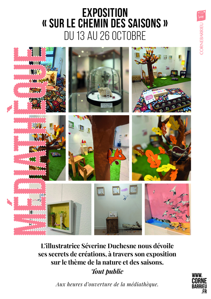 En quelques mots : Cette exposition s’articule autour de 5 albums jeunesse de l’autrice Séverine Duchesne, avec pour thématique la nature. Description : Techniques d’illustration alliant dessin, volume et photographie. Déambulation poétique pour petits et grands.