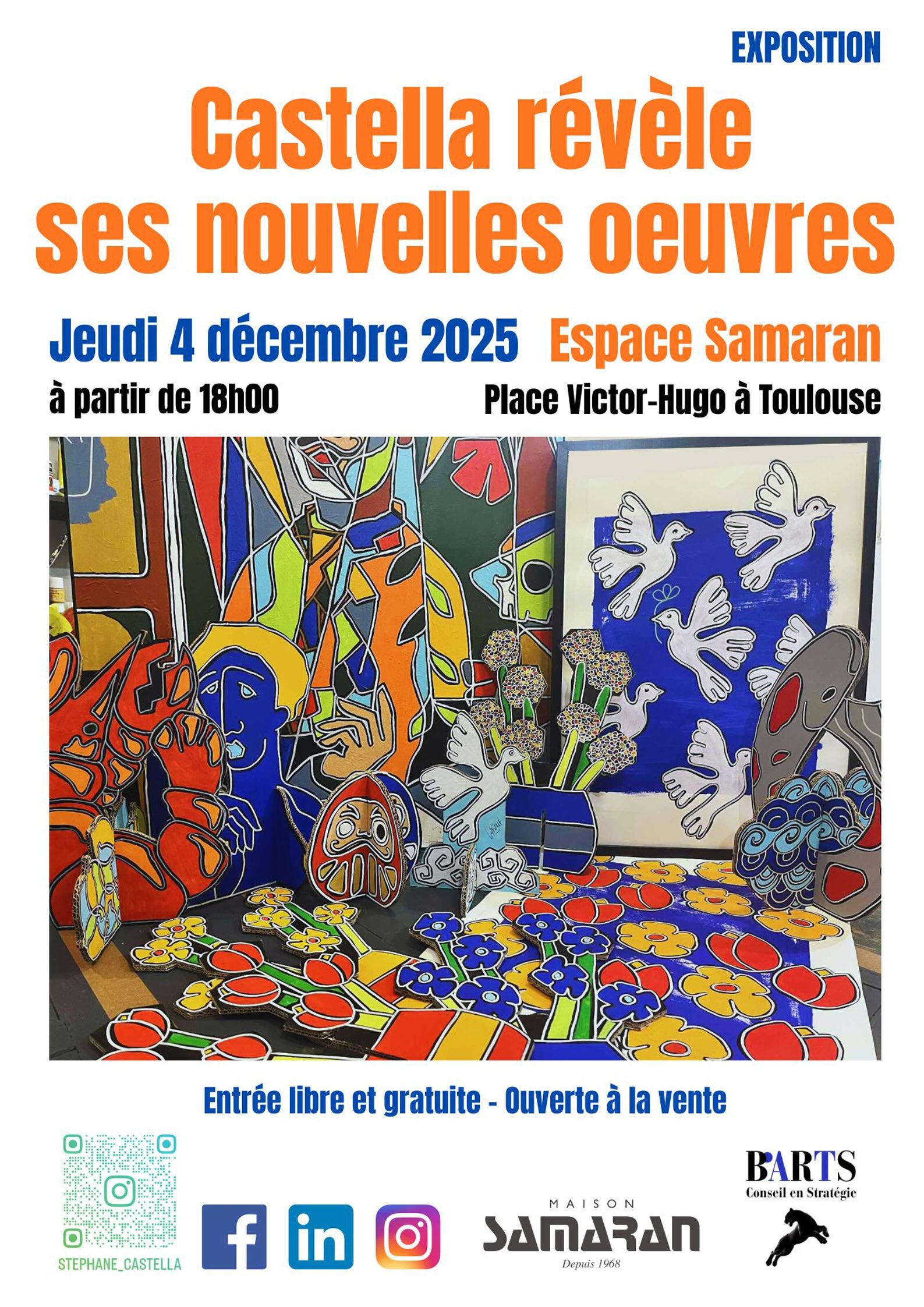 L'artiste toulousain Stephane Castella dévoilera ses nouvelles créations lors d'une exposition exclusive à l’Espace Samaran, jeudi 4 décembre 2025, à partir de 18h. Cette soirée exceptionnelle offrira au public l'opportunité de découvrir les œuvres récentes de cet artiste discret, reconnu pour son style unique et sa vision artistique singulière. L’exposition réunira une sélection de toiles colorées, d’œuvres modernes et surprenantes en 3D, réalisées sur carton, ouvertes à la vente.