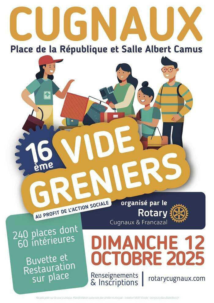Dimanche 12 octobre, 08h30En quelques mots : Venez au 16e Vide-Greniers organisé par le Rotary Club de Cugnaux & Francazal, le dimanche 12 octobre 2025 de 8h30 à 17 heures. Les années précédentes, ce sont plus de 250 exposants et