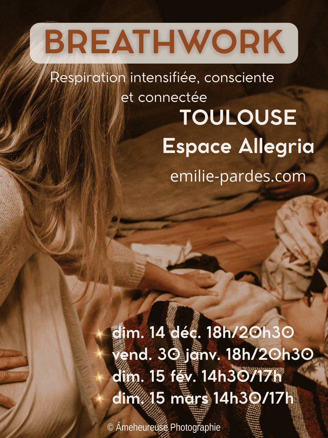Session de respiration intensifiée, consciente et connectée, issue de la respiration holotropique. Elle se réalise allongée, guidée par la voix et la musique. Elle dure 2H30, dont 30mn de respiration active par la bouche.