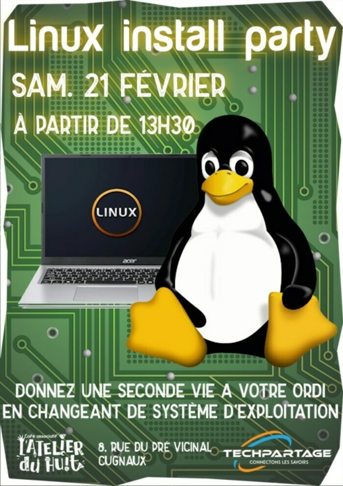 Samedi 21 février, 13h30En quelques mots : Donnez une seconde vie à votre ordinateur L’association TechPartage organise un après‑midi d’accompagnement pour installer Linux sur des ordinateurs équipés de Windows 10 ne