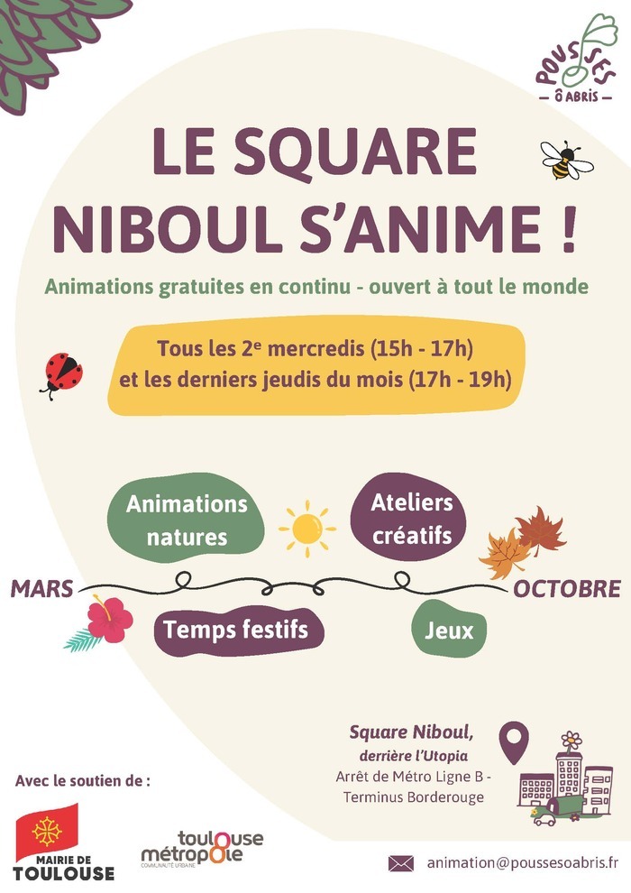 Description : De mars à octobre, les 2èmes mercredis du mois - de 15h à 17h - et les derniers jeudis du mois - de 17h à 19h - des animations gratuites ouvertes à tous seront organisées au Square Niboul.
