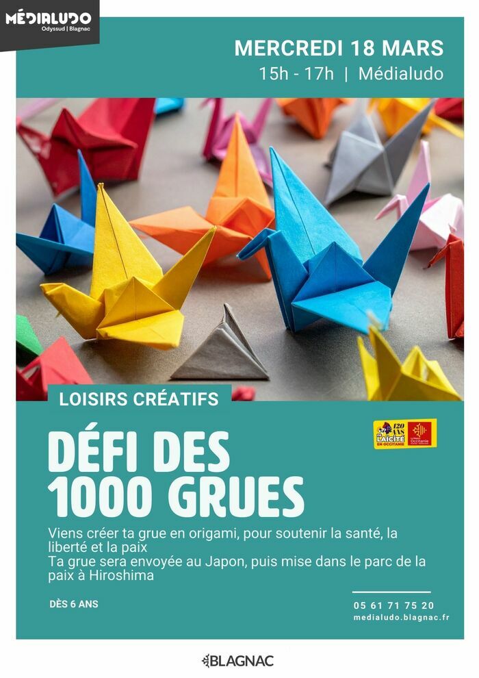 Dans le cadre de l’année de commémoration des 120 ans de la loi sur la laïcité de 1905, le projet collectif et hautement symbolique "Défi des 1000 grues" voit le jour à Blagnac. Il invite petits et grands à s’engager autour des droits des enfants, du vivre-ensemble et de la paix.