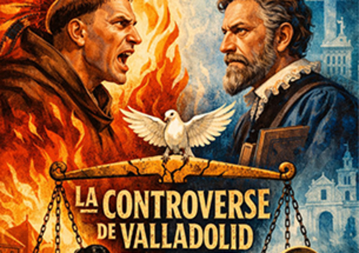 Le texte revisite le débat du XVIe siècle sur l'humanité et les droits des peuples autochtones : Las Casas défend les Indiens face aux conquistadors ; Sepulveda soutient la colonisation sous prétexte de hiérarchie naturelle.
