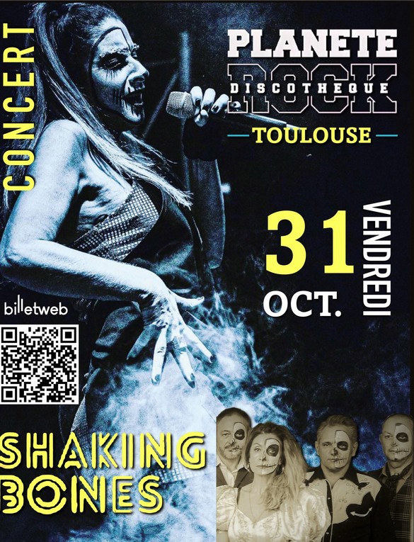 Venez découvrir le groupe Rock Toulousain SHAKING BONES qui sera en concert le 31 octobre 2025 lors de la soirée spéciale HALLOWEEN organisée par le PLANETE ROCK DISCOTHEQUE.