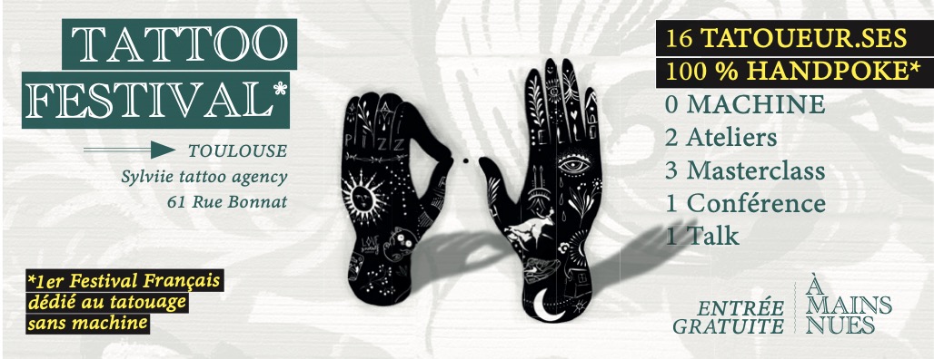 À Mains Nues est un festival consacré à l’art du tatouage handpoke, sans machine et à la rencontre entre artistes et passionné·es. Le temps d’un long week-end, 16 tatoueuses et tatoueurs aux univers singuliers partageront leur savoir-faire, leurs styles et leurs inspirations. Plus qu’un simple rendez-vous, À Mains Nues est une immersion dans la créativité, l’échange et l’expression personnelle à travers l’encre et la peau. En plus des tatouages, le festival propose des ateliers, des masterclass, une conférence et un talk