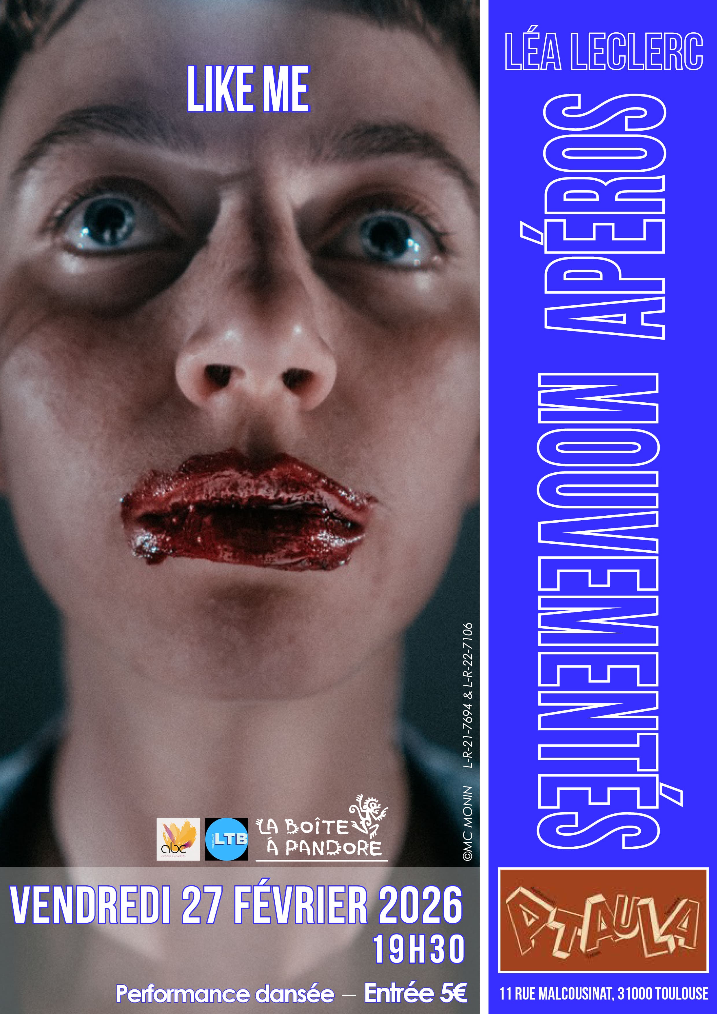 En Azémar, Dourgne, France Cycle "L'art du conte" 2026 Formation conte pour professionnels "L'art du conte" Formation de base au métier de conteuse et de conteur Unique en France, le cycle « L’art du conte » forme des conteuses et des conteurs professionnels depuis 2014. Un cycle de formation pour acquérir les techniques et les savoirs [...] A Taula, Toulouse, France Performance dansée "Like Me" - Conception et interprétation : Léa Leclerc Entrée : 5 euros (chèque ou espèces uniquement) "Like Me" Durée : 20 minutes Léa Leclerc, chorégraphe / interprète, met en scène trois poses récurrentes, trois façons de se montrer, repérées sur des profils d’influenceuses. Elle interroge l’image de soi à travers les réseaux sociaux et fait le [...] 20:00Théâtre de la Violette Elle est née endormie. Difficile alors d'avoir une conscience d'être, d'être au monde. Assise dans la salle d'attente de la vie, elle ignorait que c'était elle-même qu'elle attendait. S'extirper du voile [...]