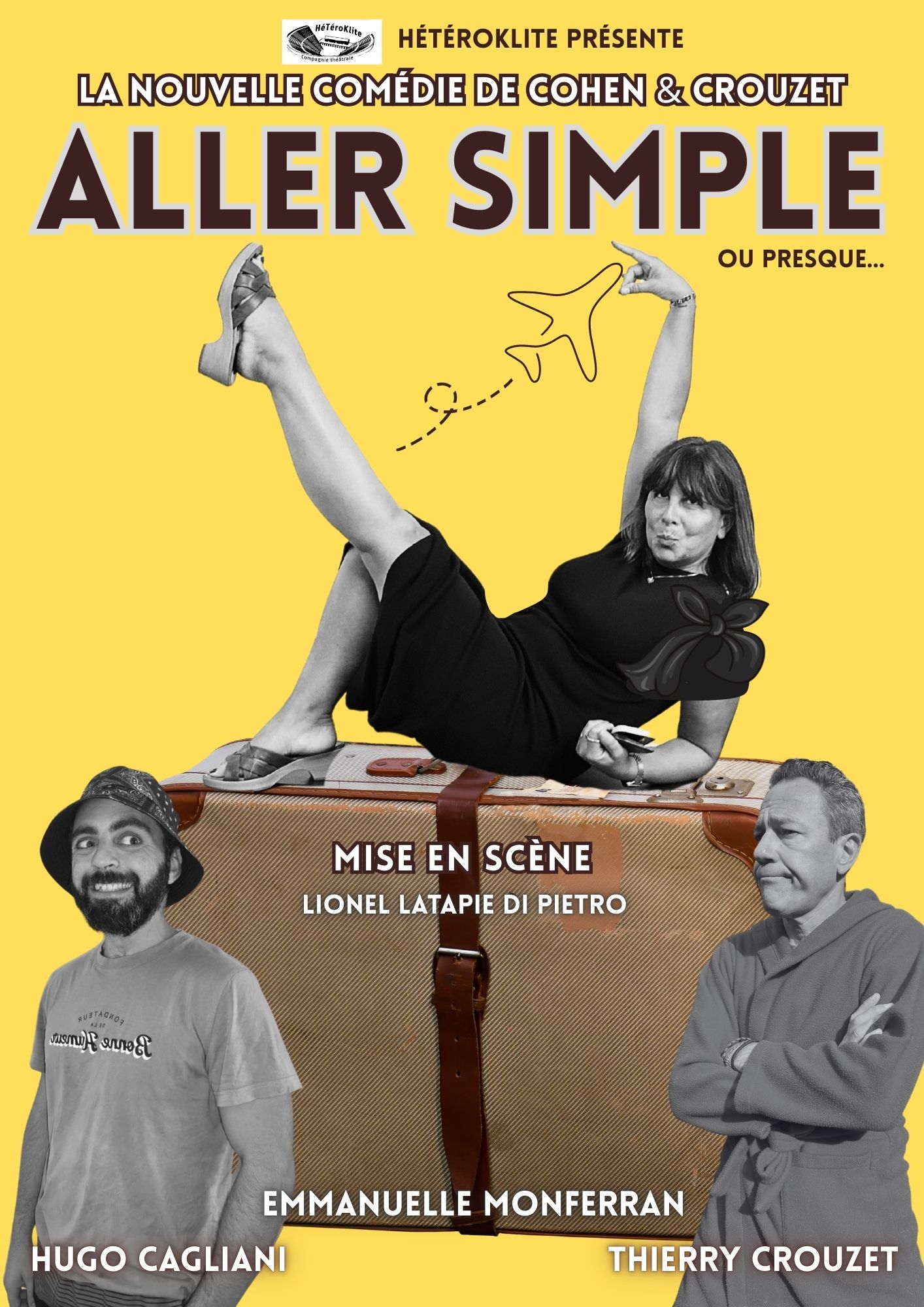 Aller Simple est la nouvelle comédie de la compagnie HéTéroKlite, pièce de théâtre écrite par Thierry Crouzet et Claude Cohen, mise en scène par Lionel Latapie di Pietro. Marie voyage trop au goût de son mari Michel. Ils passent leur temps à se disputer devant Jean, leur ami de toujours. Mais pour Marie, ce nouveau départ va tout changer quand Survient l’inconcevable, l’inacceptable, l’impensable et alors tout bascule. À ce départ en fanfare vient s’immiscer un nouveau bouleversement qui mène la pièce vers une escalade de rires. Ajoutez à ce cocktail explosif, un ami un peu bêta, et vous obtenez un délicieux moment de théâtre dans lequel les acteurs s’en donnent à cœur joie. Et si, en Aller Simple le départ est aisé, le retour est toujours plus compliqué. La raison est simple. Les mensonges disent toujours la vérité.