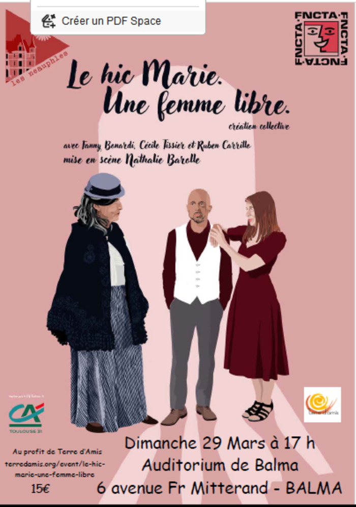 En Azémar, Dourgne, France Cycle "L'art du conte" 2026 Formation conte pour professionnels "L'art du conte" Formation de base au métier de conteuse et de conteur Unique en France, le cycle « L’art du conte » forme des conteuses et des conteurs professionnels depuis 2014. Un cycle de formation pour acquérir les techniques et les savoirs [...] Théâtre de la Violette, France Source évènement et illustration : Toulouse Métropole18 - 22 marsEn quelques mots : La Terre est fatiguée car elle a mal à ses 4 éléments : l’eau, le feu, la terre et l’air. Mademoiselle Dame Nature demande donc [...] Théâtre de la Violette La Terre est fatiguée car elle a mal à ses quatre éléments : l’eau, le feu, la terre et l’air. Mademoiselle Dame Nature demande donc à Fredo l’écolo de trouver des enfants pour soigner la [...] Mairie de Colomiers, France Source évènement et illustration : Toulouse MétropoleMercredi 18 mars, 15h30En quelques mots : Cinéma Véo Grand Central, 10 allée du RouergueDescription : Dans le cadre du cycle **Gastronomie et Arts culinaires** de l’**Université [...] Théâtre des Grands Enfants, Cugnaux, France Théâtre de la Violette, France Source évènement et illustration : Toulouse Métropole18 - 22 marsEn quelques mots : La Terre est fatiguée car elle a mal à ses 4 éléments : l’eau, le feu, la terre et l’air. Mademoiselle Dame Nature demande donc [...] Crr-espace Varèse, France Source évènement : Toulouse Métropole - Illustration : Crédits : MART PRODUCTIONMercredi 18 mars, 18h30En quelques mots : Petite scèneDescription : Le Conservatoire de Toulouse propose ce format d’auditions dont l’objectif est de prendre [...] Auditorium Saint-pierre des Cuisines, France Source évènement et illustration : Toulouse MétropoleMercredi 18 mars, 19h00En quelques mots : Orchestre symphonique C du ConservatoireDescription : **RÉSERVATION : À partir du vendredi 6 mars, 12h** [...] Zénith de Toulouse, France Source évènement et illustration : Toulouse MétropoleMercredi 18 mars, 20h00En quelques mots : Variété / Chanson française Mot(s) clef(s) : Variété / Chanson françaiseThème(s) : Spectacle - Musique Théâtre du Capitole, France Source évènement : Toulouse Métropole - Illustration : Sémiramis, Ballet de l'Opéra national du Capitole, 2024-2025 © David Herrero13 - 19 marsEn quelques mots : Nicolas Blanc, Jann Gallois, Iratxe Ansa et Igor BacovichDescription [...] L'aria, France Source évènement : Toulouse Métropole - Illustration : Alejandro Guerrero18 et 19 marsEn quelques mots : Théâtre - Dès 14 ansDescription : Plongez dans l’univers hilarant et touchant de cinq trentenaires en quête du bonheur, une mission [...] Theatre de Poche, Toulouse, France On ne rendra aucun hommage à toutes celles qu'on connaît déjà. Parce que tous les 8 mars on nous agite toujours les mêmes fanions féministes dans toute leur gloire, on sera trois femmes imparfaites pour représenter l'écrasante majorité d'humaines qui [...]